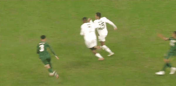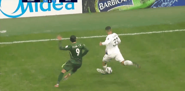 42’ จาง หยุนหนิงรู้สึกอับอายเพราะคู่ต่อสู้ของเขาเลี้ยงลูกอยู่ใต้เป้าของเขา ฟาบิโอผลักคู่ต่อสู้เพื่อเขา เพื่อนร่วมทีม