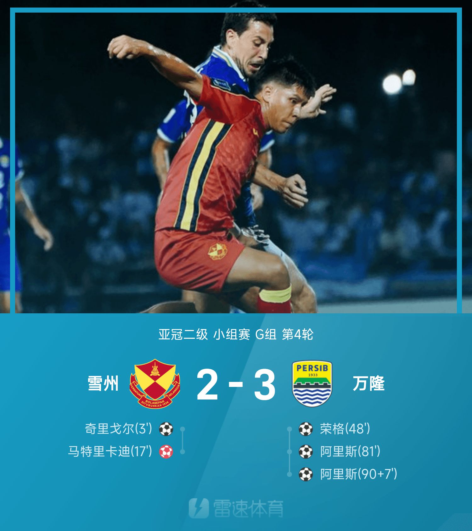 6686 ข่าวกีฬาเมื่อวันที่ 6 พฤศจิกายน ในรอบที่สี่ของกลุ่ม G ของการแข่งขันรอบสองกลุ่ม AFC Champions League ครั้งที่ 25/26 บันดุงเอาชนะสลังงอร์ 3-2 ครึ่งแรก ชิริกอร์ทำแบบสายฟ้าแลบใน 3 นาทีแรก มัทตริคาดี้จ่ายบอลให้เข้าเข้าประตูตัวเอง ครึ่งหลังจุงทำประตูได้ประตูคืน อาริสตีเสมอด้วยประตูเดียว อิซานทำพลาดครั้งใหญ่ในช่วงทดเวลาบาดเจ็บ และอริสยิงประตูสุดท้าย