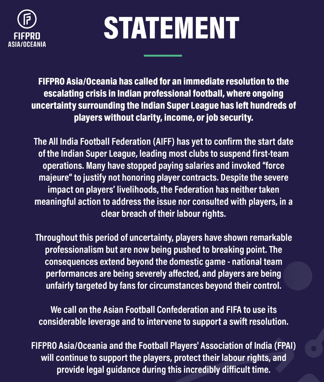 "FIFPRO Asia and Oceania Chapters เรียกร้องให้มีการแก้ไขโดยทันทีต่อวิกฤตที่กำลังเติบโตในวงการฟุตบอลอาชีพในอินเดีย ความไม่แน่นอนอย่างต่อเนื่องของพรีเมียร์ลีกอินเดียทำให้ผู้เล่นมืออาชีพหลายร้อยคนเผชิญกับภาวะที่กลืนไม่เข้าคายไม่ออกในอนาคตที่ไม่แน่นอน รายได้ลดลงอย่างมาก และขาดความมั่นคงในการดำรงชีวิต สหพันธ์ฟุตบอลอินเดีย (AIFF) ยังไม่ได้กำหนดวันเริ่มต้นของพรีเมียร์ลีกอินเดีย และสโมสรส่วนใหญ่ได้เรียกร้องให้ระงับการดำเนินงานของทีมชุดใหญ่ หลายสโมสรหยุดจ่ายเงินเดือนของผู้เล่นและปฏิเสธที่จะ ปฏิบัติตามสัญญาของผู้เล่นโดยอิงจาก 'เหตุสุดวิสัย'"