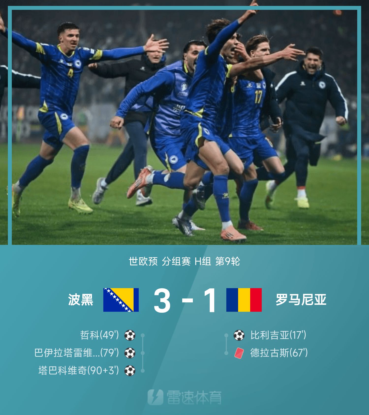 6686 Sports รายงานเมื่อวันที่ 16 พฤศจิกายนว่าในรอบที่ 9 ของกลุ่ม H ของรอบคัดเลือกโลกยุโรปครั้งที่ 26 บอสเนียและเฮอร์เซโกวีนาเผชิญหน้ากับโรมาเนียในบ้าน ในครึ่งแรก โรมาเนียออกสตาร์ทได้อย่างยอดเยี่ยม โดยวิลลาเกียทำประตูได้ ในครึ่งหลังบอสเนียและเฮอร์เซโกวีนาเริ่มใช้ความแข็งแกร่งและเชโก้ตีเสมอด้วยการทำลายผู้รักษาประตู Dragus ถูกส่งตัวออกไปเนื่องจากละเมิดกฎอย่างร้ายแรงเมื่อสองนาทีในเกม ชายสิบคนของโรมาเนียเผชิญหน้ากับบอสเนียและเฮอร์เซโกวีนา นาทีที่ 79 บาจลาตาเรวิช ยิงประตูพลิกสถานการณ์ และ ทาโควิช ทำประตูปิดเกม วิลลาเกียล้มเหลวในการทำประตูและช่วยชีวิตผู้ช่วยให้รอด ท้ายที่สุด บอสเนียและเฮอร์เซโกวีนาเอาชนะโรมาเนีย 10 คนได้ 3-1