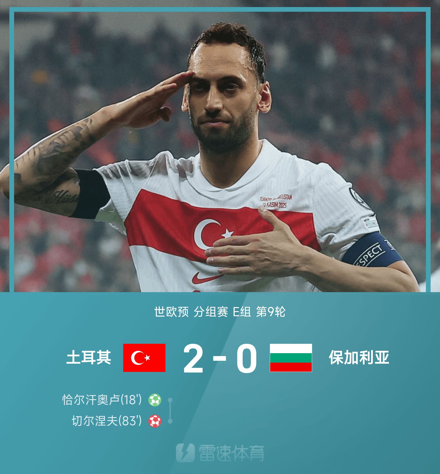 6686 Sports รายงานเมื่อวันที่ 16 พฤศจิกายนว่าในรอบที่ 9 ของกลุ่ม E ของเกมรอบคัดเลือกโลกยุโรปครั้งที่ 26 ตุรกีเอาชนะบัลแกเรีย 2-0 ในครึ่งแรกของเกม Charhanoglu ยิงจุดโทษ และในครึ่งหลัง Chernev ทำเข้าประตูตัวเองเพื่อช่วยTürkiyeเอาชนะคู่ต่อสู้