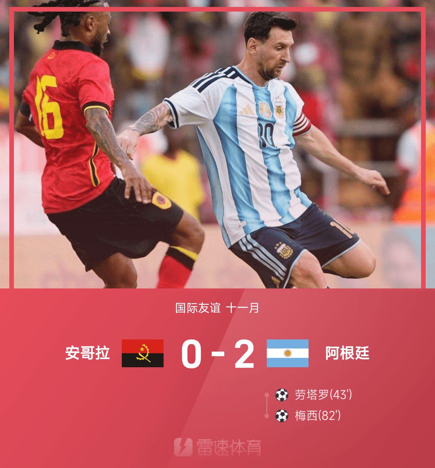 44' เมสซี่จ่ายบอล เลาตาโรวอลเลย์เข้าประตู และอาร์เจนตินานำแองโกลา 1-0 ชั่วคราว