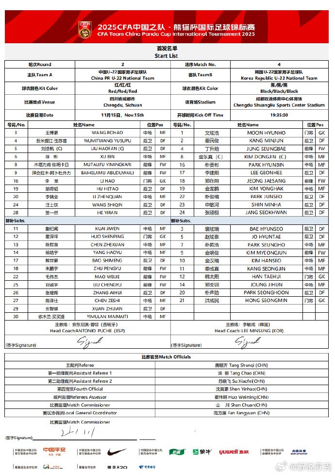 6686 ข่าวกีฬา วันที่ 15 พฤศจิกายน ตามเวลาปักกิ่งของวันนี้ ในรอบที่สองของ Panda Cup ฟุตบอลทีมชาติ U22 พบกับเกาหลีใต้ U22 ก่อนเกมทั้งสองฝ่ายประกาศรายชื่อตัวจริง