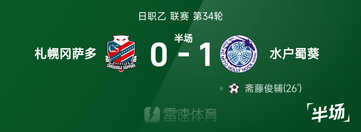 นิปปอน โปรเฟสชั่นแนล บี พักครึ่งเวลา: ชุนสุเกะ ไซโตะ ทำประตู, คอนซาโดล ซัปโปโร 0-1 มิโตะ ฮอลลี่ฮ็อค
