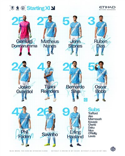 รายชื่อตัวจริงของแมนเชสเตอร์ ซิตี้: 25-ดอนนารูมา, 5-สโตนส์, 3-ดิอาส, 27-นูเนซ, 24-กวาดิโอล, 20-B ที่นั่ง, 47-โฟเดน, 4-เรนเดอร์ส, 26-ซาวินโญ่, 52-บ็อบ, 9-ฮาลันด์