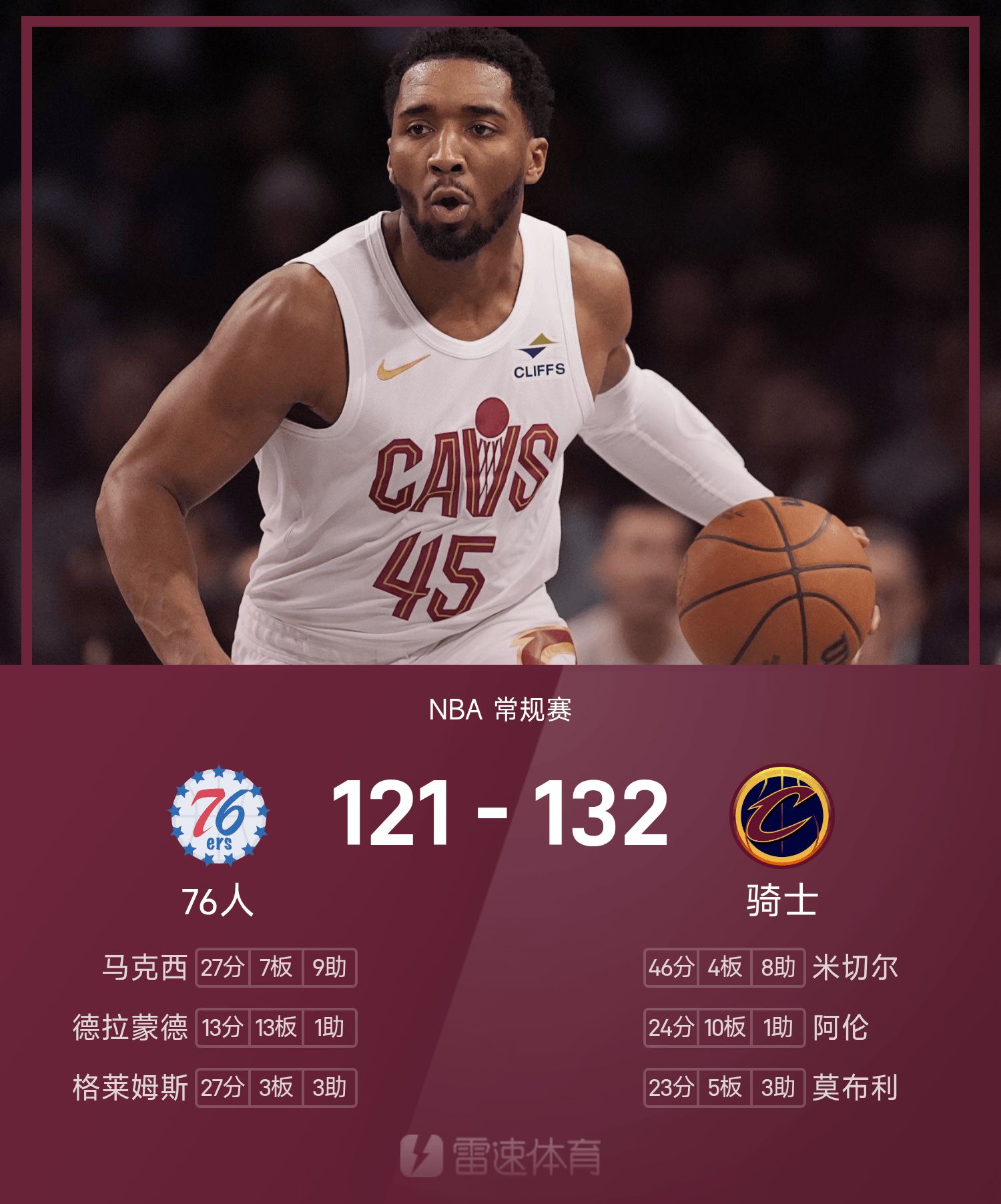 มิทเชลล์ทำคะแนนสูงสุดในฤดูกาล 46 คะแนน และ Cavaliers เอาชนะ 76ers ได้
