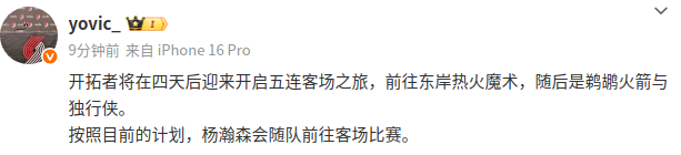 ข้อความต้นฉบับจากโซเชียลมีเดีย: "ทีมเทรลเบลเซอร์จะนำการเดินทางห้าเกมไปยัง East Coast Heat and Magic ตามด้วย Pelicans, Rockets และ Mavericks ตามแผนปัจจุบัน Yang Hansen จะร่วมทีมในเกมเยือน"
