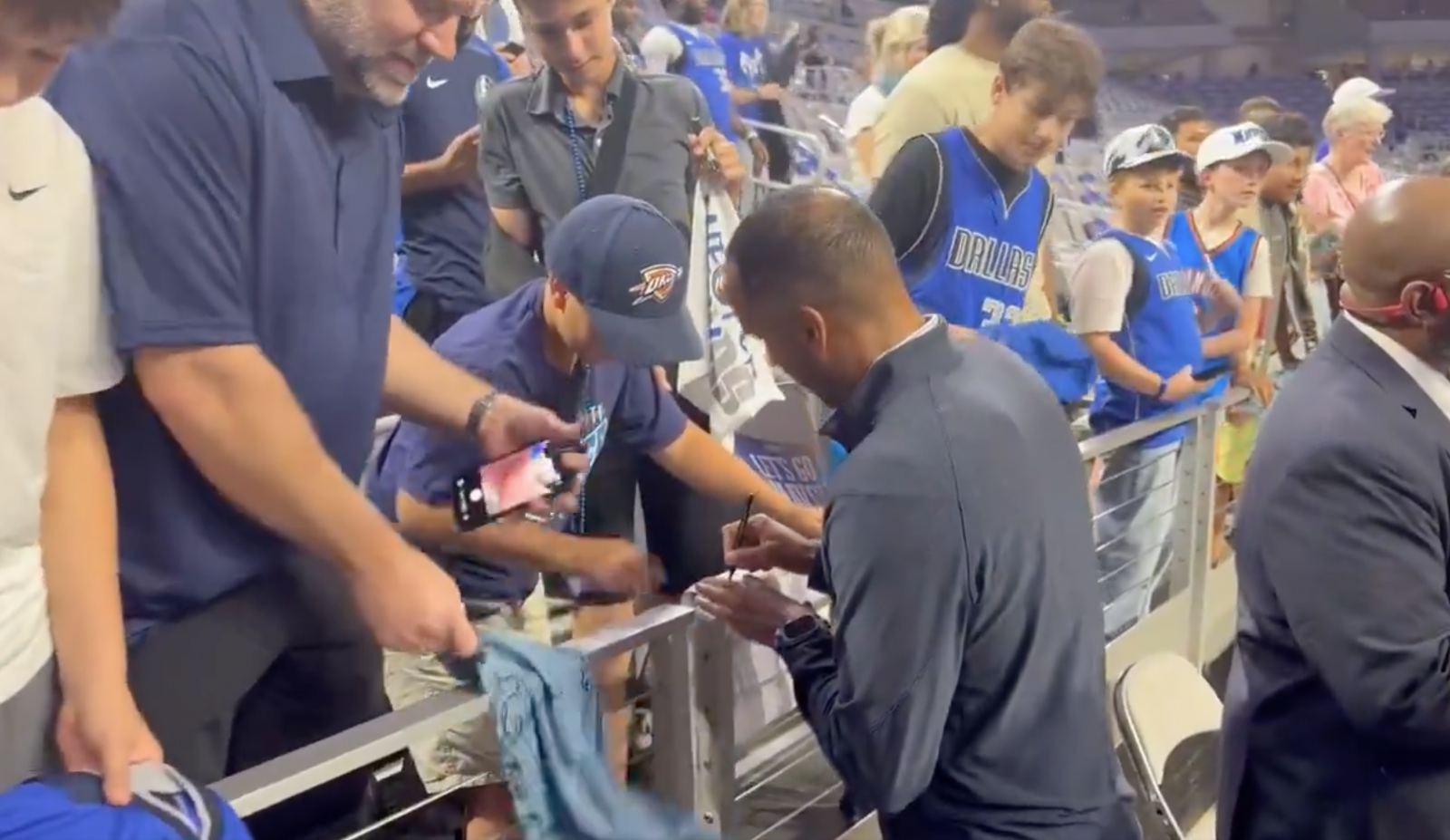 ก่อนเริ่มเกม นิโค แฮร์ริสัน ผู้จัดการทั่วไปของ Mavericks มาที่ข้างสนามและแจกลายเซ็นและถ่ายรูปให้กับแฟนๆ เป็นที่น่าสังเกตว่าแฮร์ริสันไม่เพียงแต่เซ็นลายเซ็นและถ่ายรูปให้แฟน ๆ Mavericks เท่านั้น แต่ยังเซ็นลายเซ็นให้แฟน Thunder รุ่นเยาว์อีกด้วย แต่ในหมู่แฟนๆ เขาจงใจข้ามแฟนหนุ่มที่สวมชุดของ Doncic Mavericks โดยแกล้งทำเป็นไม่ได้ยินคำขอของฝ่ายหลัง และเลือกที่จะจากไปโดยตรง