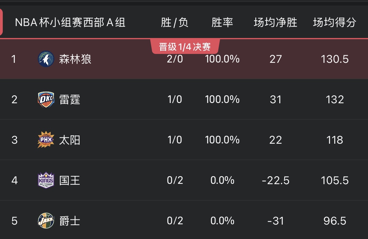 ในการประชุมสายตะวันตก กลุ่ม A Timberwolves มีสถิติที่แข็งแกร่งด้วยการชนะ 2 แพ้ 0 ด้วยเรตติ้งสุทธิที่ +54 ขณะนี้พวกเขาอยู่ในสถานการณ์ที่ดีที่จะผ่านเข้ารอบ และสองเกมถัดไปของพวกเขากับเดอะซันส์และธันเดอร์จะเป็นตัวกำหนดจุดผ่านเข้ารอบในกลุ่มนี้