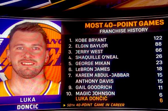 US TV นับจำนวนเกมมากกว่า 40 เกมในประวัติศาสตร์ของ Lakers: Doncic ตีเสมอ Magic และเสมอกันที่สิบ LeBron อยู่อันดับหกด้วย 18 ครั้ง และ Kobe ขึ้นนำด้วย 122 ครั้ง