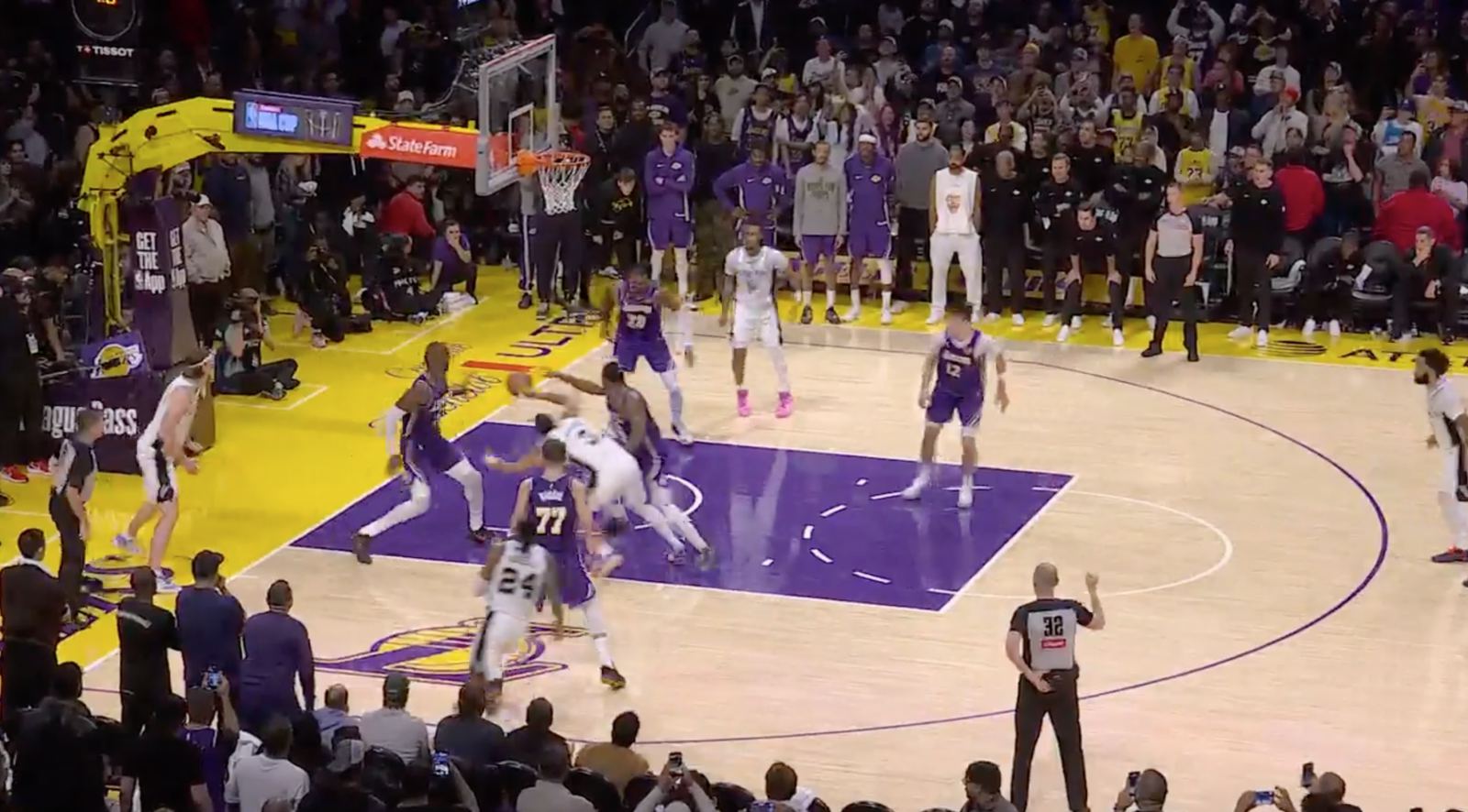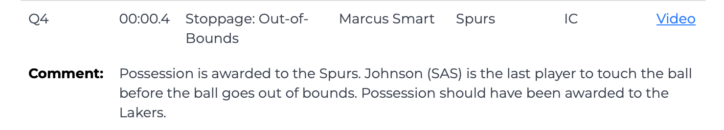 ในช่วง 0.4 วินาทีที่ผ่านมา ก่อนที่ลูกบอลจะออกนอกเขต เคลดอน จอห์นสัน เป็นคนสุดท้ายที่สัมผัสลูกบอล แต่ผู้ตัดสินเรียกสมาร์ทแล้วลูกบอลออกนอกเขตและมอบบอลให้สเปอร์ส นี่เป็นการตัดสินที่ไม่ถูกต้อง และควรมอบลูกบอลให้กับ Lakers