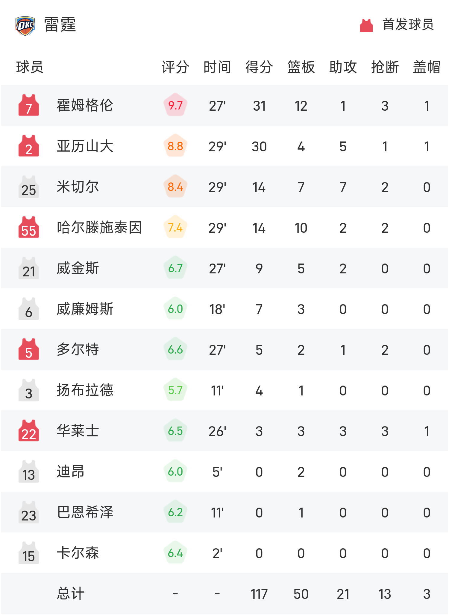 โฮล์มเกรนทำคะแนนสูงสุดในเกม 31 แต้ม 12 รีบาวน์และ 1 แอสซิสต์ นำทีมธันเดอร์คว้าชัยชนะ